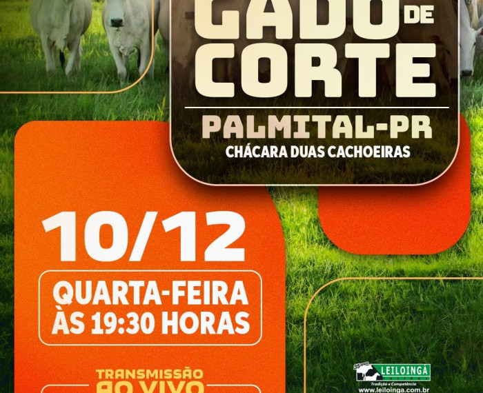 DEZ 10 Ver mais detalhes do evento e dos lotes disponíveis 10 de Dezembro às 19:30H LEILÃO GADO DE CORTE - PALMITAL-PR PALMITAL - PR CHACARA DUAS CACHOEIRAS